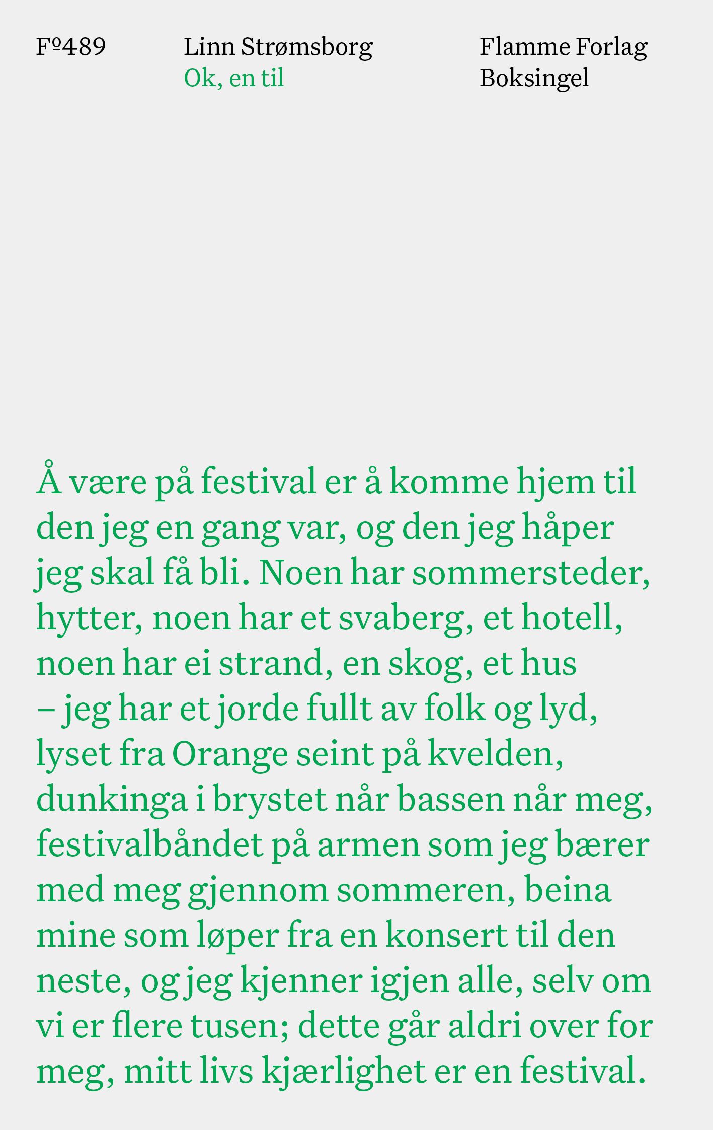 I 2009 debuterte Linn Strømsborg med boka Roskilde. 13 år senere er hun tilbake på festivalen og med boksingelen Ok, en til. De fem unge voksne er blitt til tre litt eldre. De har kanskje slått opp telt litt lenger unna scenekanten, men egentlig er alt det samme. Det er telt og regn, Spaghetti 50 og lunka øl. Det er musikk og alt annet som gjør livet mirakuløst og fantastisk. Hvor mange historier utspiller seg på Roskilde hvert år, er det første spørsmålet hun stiller seg i boka fra 2009 – i 2022 er hun fortsatt ikke ferdig med å fortelle dem. For det går aldri over. Det kommer aldri til å gå over for henne.