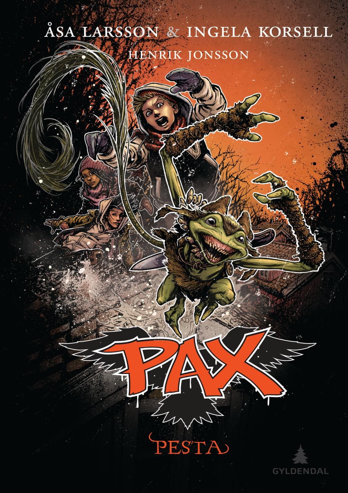 Stadig flere i Mariefred blir syke med merkelige symptomer, og noe botemiddel finnes ikke. Da Alriks og Viggos egen familie også blir rammet, trekkes guttene inn i en kamp mot tiden for å finne en løsning. Men hvordan skal en sånn mystisk sykdom bekjempes? Samtidig kommer Iris med en plan for å finne ut hvem Svartheksa er. Men planen er livsfarlig. Dessuten lukter den råttent lik ... Pesta er sjuende del av bokserien PAX. Åttende del, Hvitormen, kommer våren 2017. PAX Bloggrecensioner NIDSTÅNGEN & GRIMMEN Min deckarfavorit Åsa Larsson goes 9-12, och jag läser såklart nya serien”Pax” direkt. Den är hittills planerad i 10 delar, och nu har de första två släppts. Huvudpersoner är två bröder som pga alkoholiserad mamma nyligen flyttat in hos fosterföräldrar i Mariefred. Och i Mariefred blir det magi och action så det står härliga till. Jag tycker ”Pax”-starten är väldigt spännande och mycket svår att lägga ifrån sig när man börjat läsa. Ren och skär cliffhangerbonanza! Åsa Larsson har samarbetat med en medförfattare, Ingela Korsell, och en illustratör, Henrik Jonsson, och jag hade lite farhågor kring det. Tänk om det skulle bli för utslätat och inte så Åsa Larsson-skt? Men icket, jag blir nöjd. Fina personteckningar, bra dialoger, bra ton, allt det jag gillar hos henne. En hel del hundar i ”Pax” också! Fast en sak undrar jag, VAR är brudarna? Det är verkligen extremt mycket killar i de här böckerna. Huvudpersonerna är killar och de andra i deras klasser som det handlar lite om är också det. Bara killar, killar, killar vart man än ser. Kommer det några brudar någon gång, eller har man fallit i den skittråkiga tanketråden att om killar ska vilja läsa så måste det handla om killar? http://bokhora.se/2014/var-ar-brudarna-2/ Alrik och Viggo har just kommit som fosterbarn till trevliga paret Laylah och Anders i Mariefred. Brödernas mamma är alkholiserad och orkar inte med sina två pojkar. Just nu i alla fall. Men Alrik och Viggo är streetsmarta, de är vana att flytta runt, byta skola, slåss och klara sig ur knipor. Stjäla som korpar gör de också, åtminstone Viggo även om Alrik försöker hålla honom i hampan. Nu måste de faktiskt sköta sig. Men hur lätt är det. När den där Simon som kallas Kingen, styr skolan. Han tål inga utmaningar och nu ska de där jävla Stockholmsungarna sättas på plats. Så Viggo hamnar i slagsmål. Alrik försvarar och sen är det kört. Första dagen i skolan och redan fullkomligt kaos. Träslöjdsläraren Thomas pekar med hela handen och hotar med konsekvenser. Bröderna flyr och hamnar i ett ännu värre problem när Alrik kastar sten i ett glashus i stan så att flera rutor kraschas. Det är så pojkarna lär känna Magnar och Estrid. Som driver trädgården och växthuset. Kanske är det ingen slump att pojkarna kom just till dem. Korpvingar i halsbanden. Två tvåhänta bröder. På det gamla trädgårdsbordet landar två svartglänsande korpar. Alla tecken stämmer! Men de är ju bara barn. Kan dessa två tjuvungar vara de krigaren som Estrid och Magnar har väntat på? De sätts på prov och får städa det underjordiska, hemliga biblioteket som straff. Där finns en hylla de absolut INTE får röra. Men... Viggo vill veta. Såklart. Första delen i en Paxserien heter Nidstången och man blir fast från första stund. Det är just en sån här serie vi har väntat på. Spänning, magi, underdog och nordisk mytologi. Lägg därtill en mysig och puttenuttig stad med gränder och trähus där ondskan har sluppit ut. Nidstången måste räddas. Om den kommer i orätta händer vill man inte tänka på vad som kan ske. Åsa Larsson kan bygga en spännande historia. Tillsammans med Ingela Korsell har hon skrivit en bok som kryper in under skinnet och som både är lättläst och rafflande. Det här är riktigt, riktigt bra och helt enkelt beroendeframkallande. Del två i serien, Grimmen, har redan kommit ut. Det kommer att blir tio delar allt som allt. Med Henrik Jonssons mangainspirerade illustrationer blir det en fullträff. http://barnochungdomsbok.blogspot.se/search?q=nidst%C3%A5ngen PAX - Nidstången och Grimmen Mina förväntningar var skyhöga inför läsandet av nya serien PAX. Favoritdeckarförfattaren Åsa Larsson skulle begå barnboksdebut tillsammans med författaren Ingela Korsell och illustratören Henrik Jonsson. Urban fantasy för 9-12-åringar, i Mariefred, med svensk och fornnordisk mytologi som bas. Skyhöga förväntningar är lite läskiga att hantera, och jag har läst böcker som andra vuxenförfattare har skrivit för barn och som mest blivit tramsiga snarare än faktiskt ha blivit skrivna för barnen. Så hur skulle det bli? Riktigt, riktigt bra är det. Jag är så nöjd, så nöjd. I fredags hade vi äntligen fått de två första böckerna i PAX-serien till vårt bibliotek:Nidstången och Grimmen, och jag lånade med dem hem över helgen. Slukarläste. Kunde inte släppa. Plockade upp del två direkt när jag avslutat del ett. Nidstången avslutas nämligen med en elak cliffhanger, så det var bara att läsa vidar...