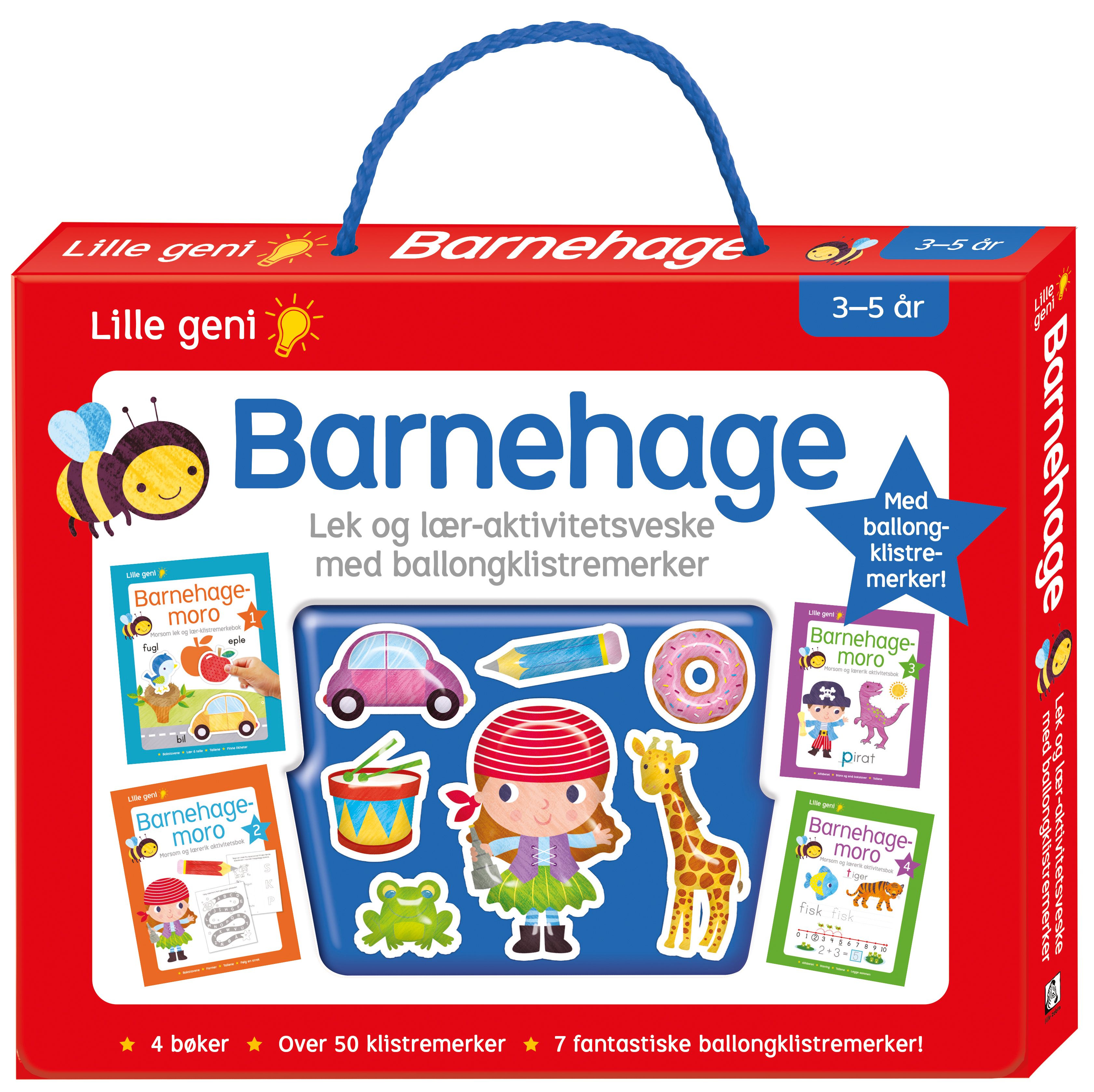 Gjør læringen til en lek! Her får barna tidlig læring, lære sammen, lære alfabetet, skrive bokstaver, følge streker, og lære å telle. Denne aktivitetsvesken inneholder 4 bøker, hvor barna kan øve på alfabetet, skrive bokstaver, finne likheter, lære tall og å telle og mye mer. Klistremerkene som følger med brukes til oppgavene i bøkene, mens de kule ballongklistremerkene kan brukes til pynt.