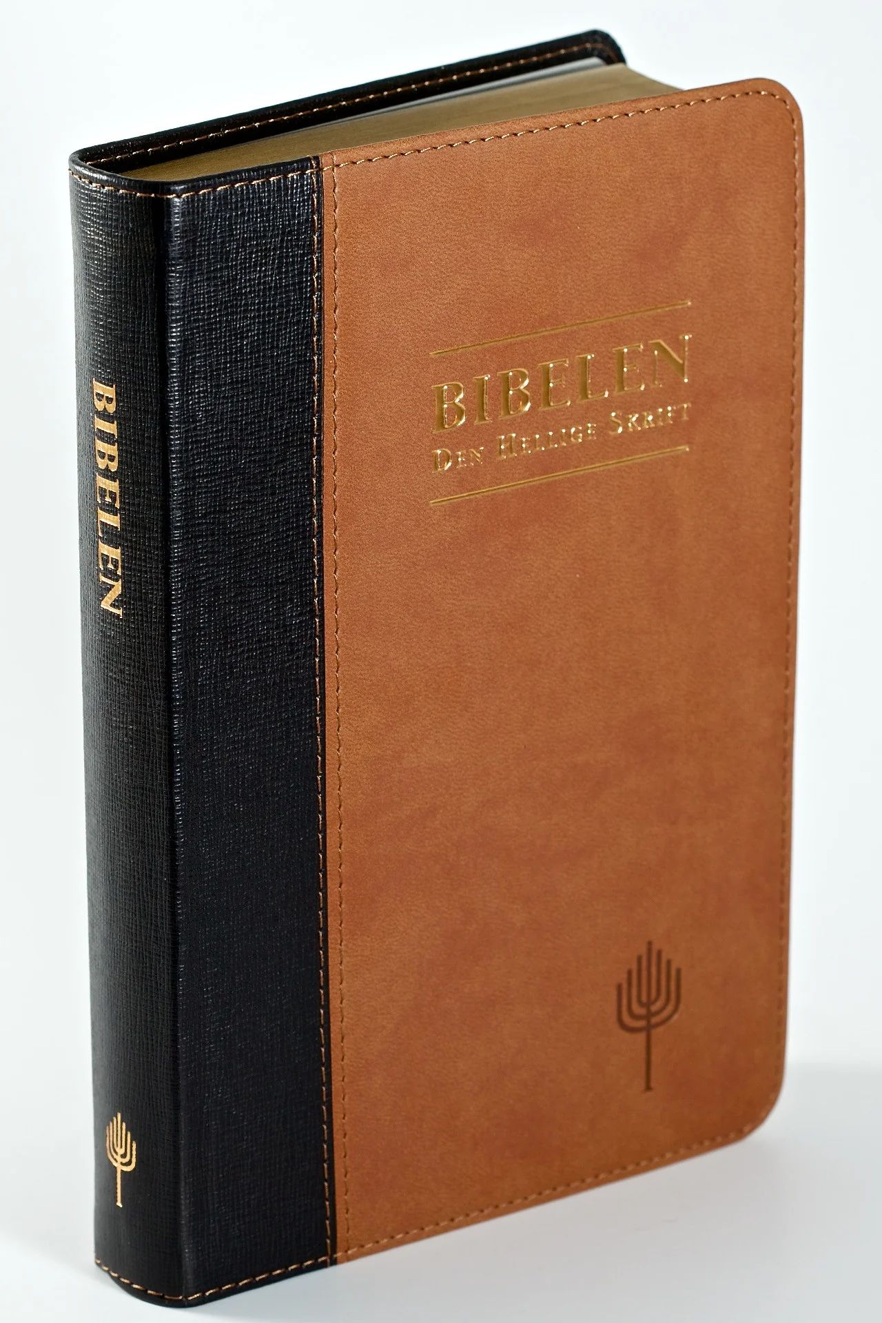 En bruksbibel med stor og god skrift. Bokblokka måler 14 x 21 cm. Denne bibelen har både gullsnitt, og det samme fine bibelpapiret som skinnutgavene. Omslaget er i mykt sort og lys brunt kunstskinn av god kvalitet.