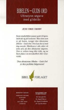 Bibelen er ekstra tynn slik at den er enkel å ta med seg. Med Jesu ord i rødt. Har personlig gaveside, slektstre, kart og lesebånd.