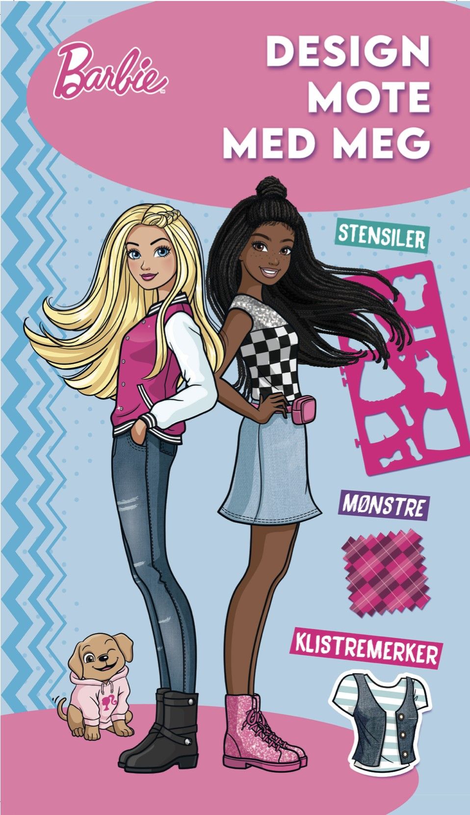 Barbie! Design mote med meg er en bok på 36 sider + 12 sider med stoff, 2 sider med stensiler og 1 side med klistremerker.