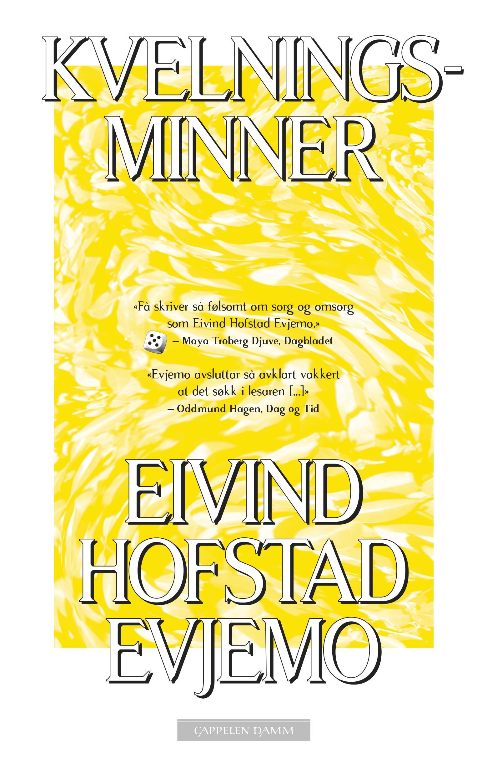 I Kvelningsminner møter vi dem som må sende sine kjære vekk fra hjemmet, til institusjoner, og følger dem i letingen etter den verdigheten som er menneskelighetens kjerne. Fra de største spørsmålene om liv og død, scener fra alderdommen, til det å formidle et multihandikappet menneskes verd til sine besøkende slektninger: Ingen forfattere formidler den store, store fortellingen i det daglige strevet på samme måte som Eivind Hofstad Evjemo.