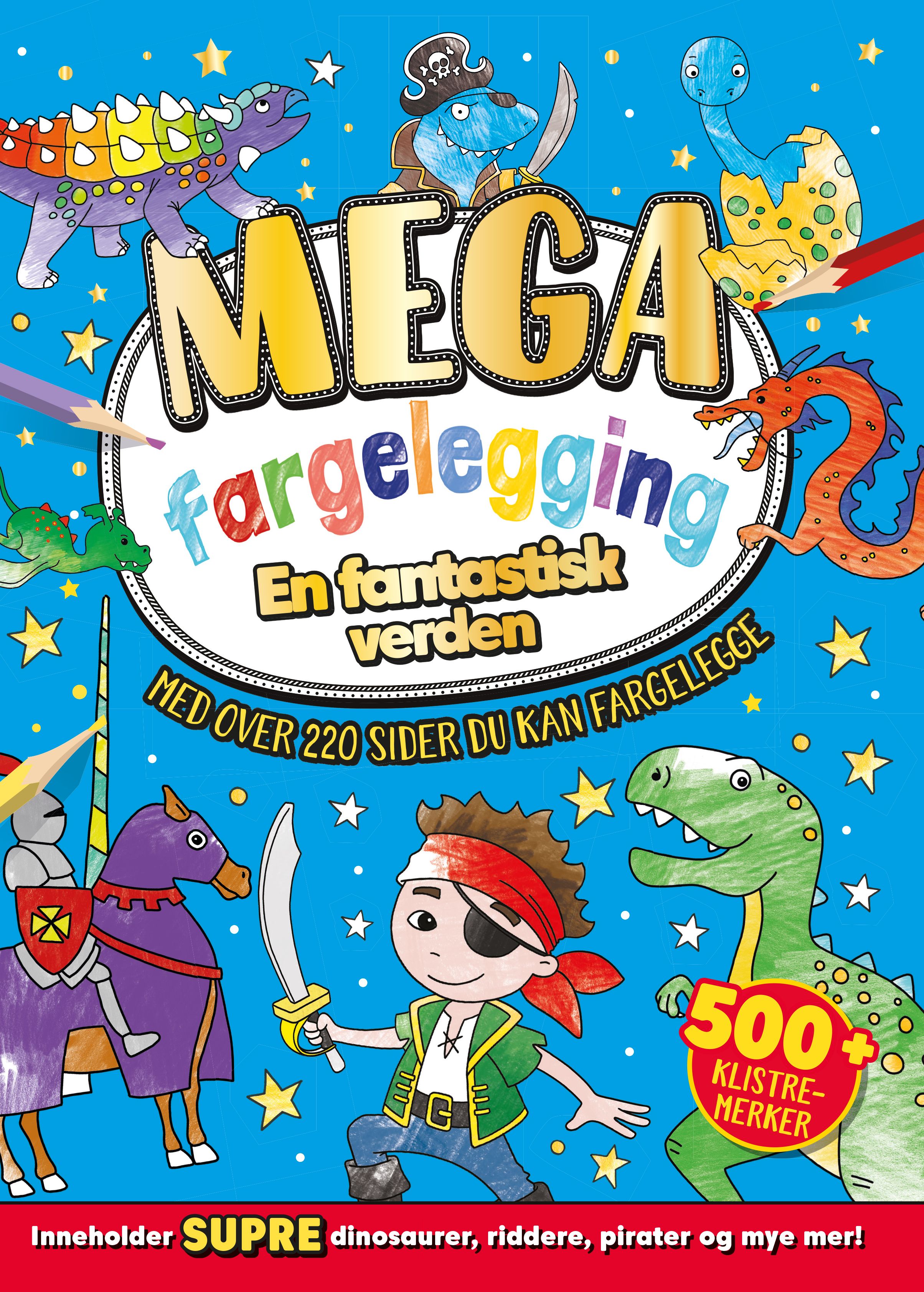 Dette er en bok på 220 sider med kule motiver fra en spennende verden med dinosaurer, riddere, pirater og mye mer, som du kan fargelegge. Boken har også litt tekst så du kan øve deg på å lese underveis. Det følger med over 500 klistremerker som du kan bruke til å pynte med.