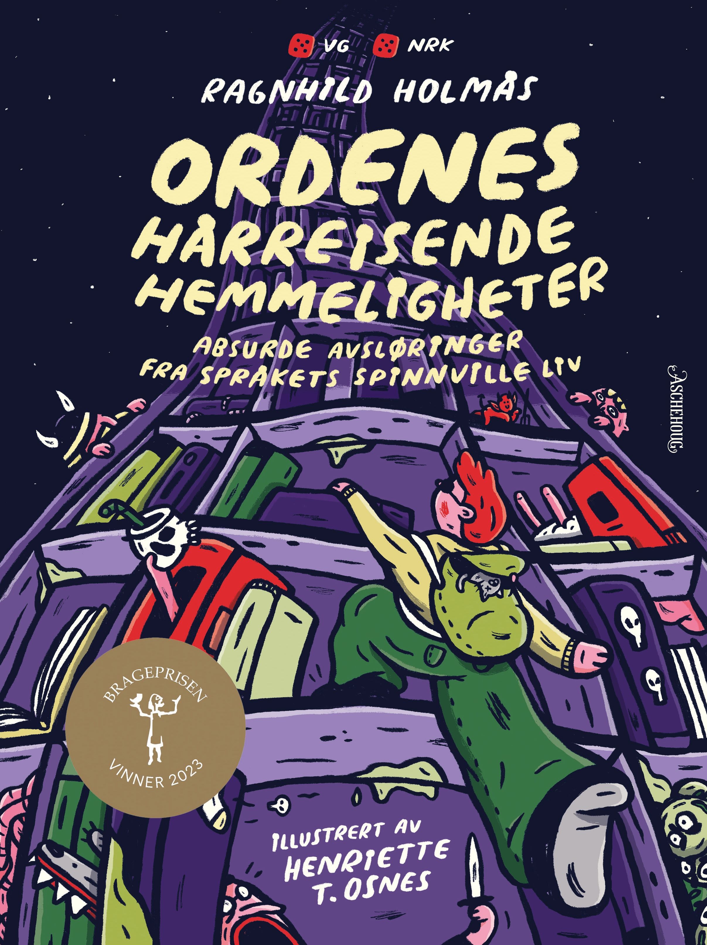 VINNER AV BRAGEPRISEN 2023 I KATEGORIEN SAKPROSA FOR BARN OG UNGE Hvert eneste ord du bruker, har en hemmelighet. Buksen din er oppkalt etter en geitebukk. Nachoen du spiser, er oppkalt etter en meksikansk nese, og du dypper den i guacamole, som betyr 'testikkelsaus'. Språkets morsomste, flaueste og skumleste livshistorier brettes ut som små noveller i "Ordenes hårreisende hemmeligheter", en grenseoverskridende praktbok om etymologi for barn. Boken passer for nysgjerrige barn fra ni år. "Ordenes hårreisende hemmeligheter" er skrevet av Ragnhild Holmås og illustrert av Henriette Osnes ("Une og skolestarten", 2022). Sammen skaper de er rikt og rampete univers som ligner David Walliams'. «Ragnhild Holmås er den nye vinen. For henne er det innfallsmetoden og lystprinsippet som gjeld. Sist nokon gjekk så iherdig og motkulturelt til verks for å få folk til å elske og eige språket sitt sjølv, må vel ha vore då Ivar Aasen gjekk landet på langs og tvers for å samle inn orda og gje dei tilbake til folk der dei fanst.» Janne Karin Støylen, Bergens Tidende (fem av seks hjerter) «Forfatterens egen lidenskap for rare og morsomme historier om ord smitter umiddelbart over på leseren. Det er måten Holmås formidler sin kunnskap på som løfter prosjektet. Hun tøyser med språket og oppretter en helt unik sfære med leseren. Holmås' samarbeid med illustratør Henriette T. Osnes er sømløst. Her har begge spilt på lag med samme visjon. Osnes' illustrasjoner er rølpete og fulle av treffsikker humor.» Ruth Hege Halstensen, Klassekampen "Et mirakel har truffet planeten vår. Det fines mellom to permer og er satt sammen av en herlig frekk og formidlingsdyktig forfatter og ditto illustratør. [...]Boka er ikke mindre magisk enn at både barn og voksne kan ha like stor glede av dem. [...] En bok jeg utvilsomt vender tilbake til. Og det gleder jeg meg til." Joakim Tjøstheim, @litteraturviteren «Ellevilt om ordenes opprinnelse. Burlesk, ufyselig og morsom. Ja, så fengende kan sakprosa for barn være.» Anne Cathrine Straume, NRK (Terningkast 5)