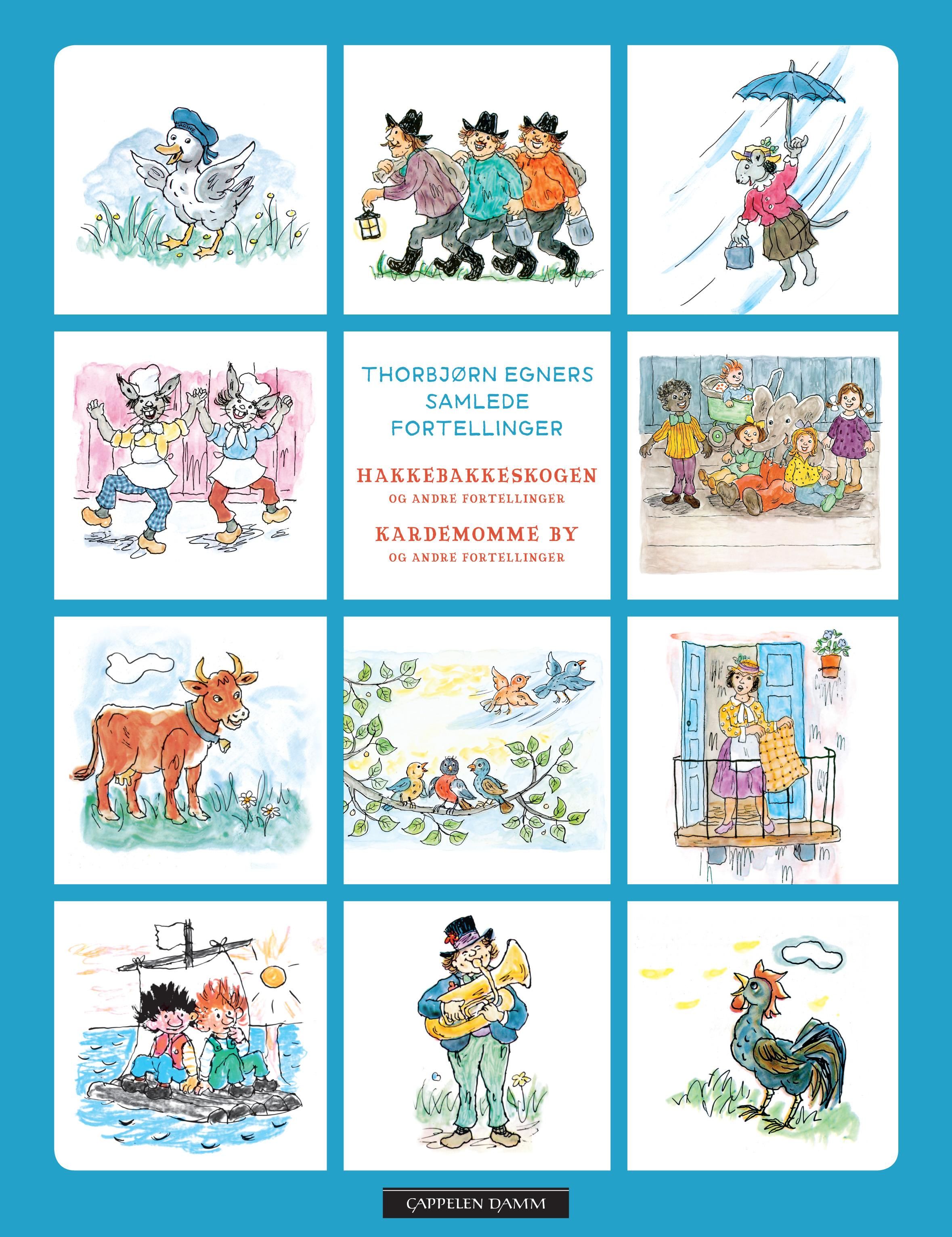 I denne flotte gaveboksen finner du Thorbjørn Egners samlede utgivelser for barn og unge. Hver av bøkene inneholder 4 historier. Det første bindet er en samling av Klatremus og de andre dyrene i Hakkebakkeskogen, Karius og Baktus, Musikantene kommer til byen og Da Per var ku. Bind 2 består av Folk og røvere i Kardemomme by, Telleboka, Jumbo som dro ut i verden og Ole Jakop på bytur.