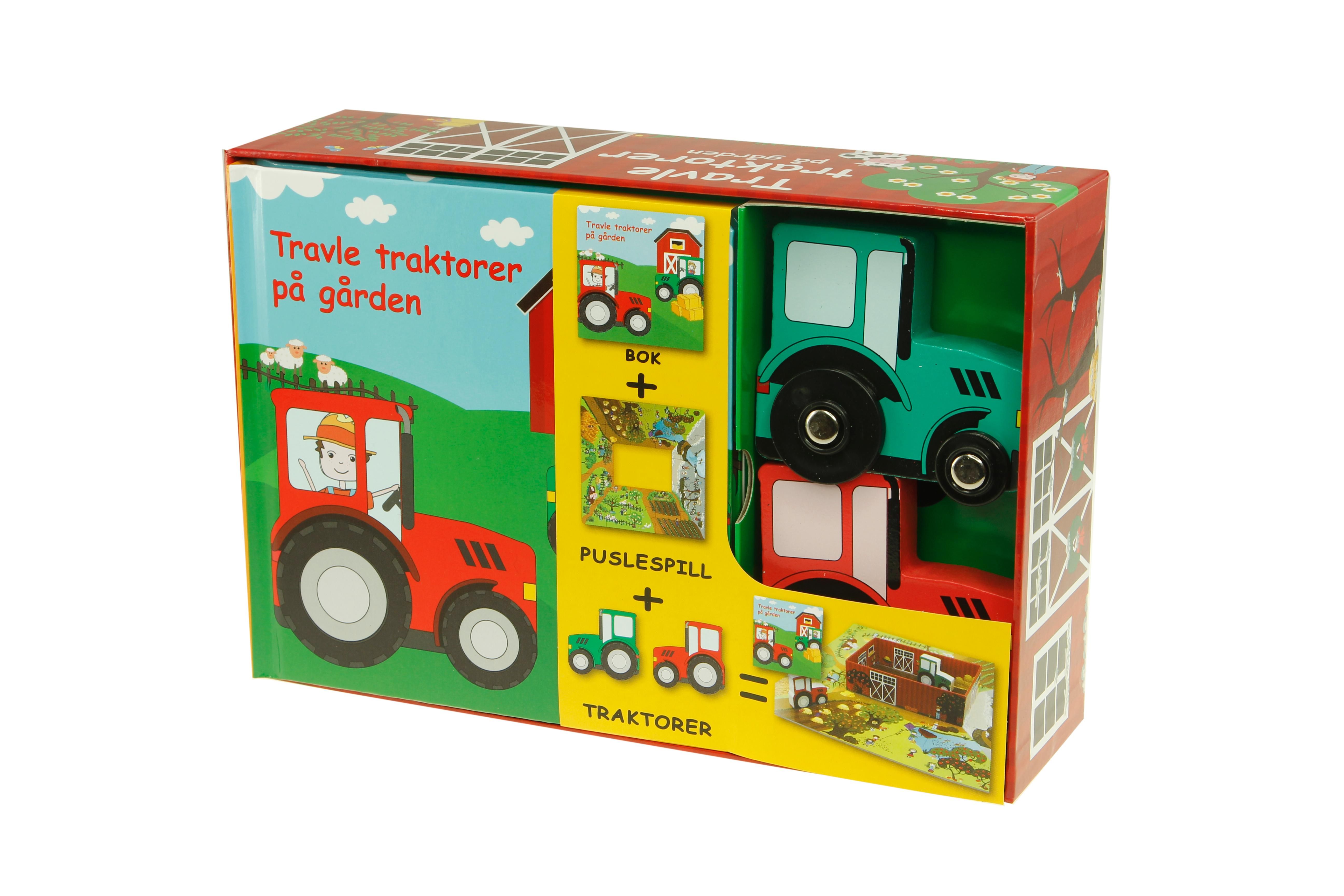 Travle traktorer på gården. 1 bok. 1 puslespill. 2 traktorer