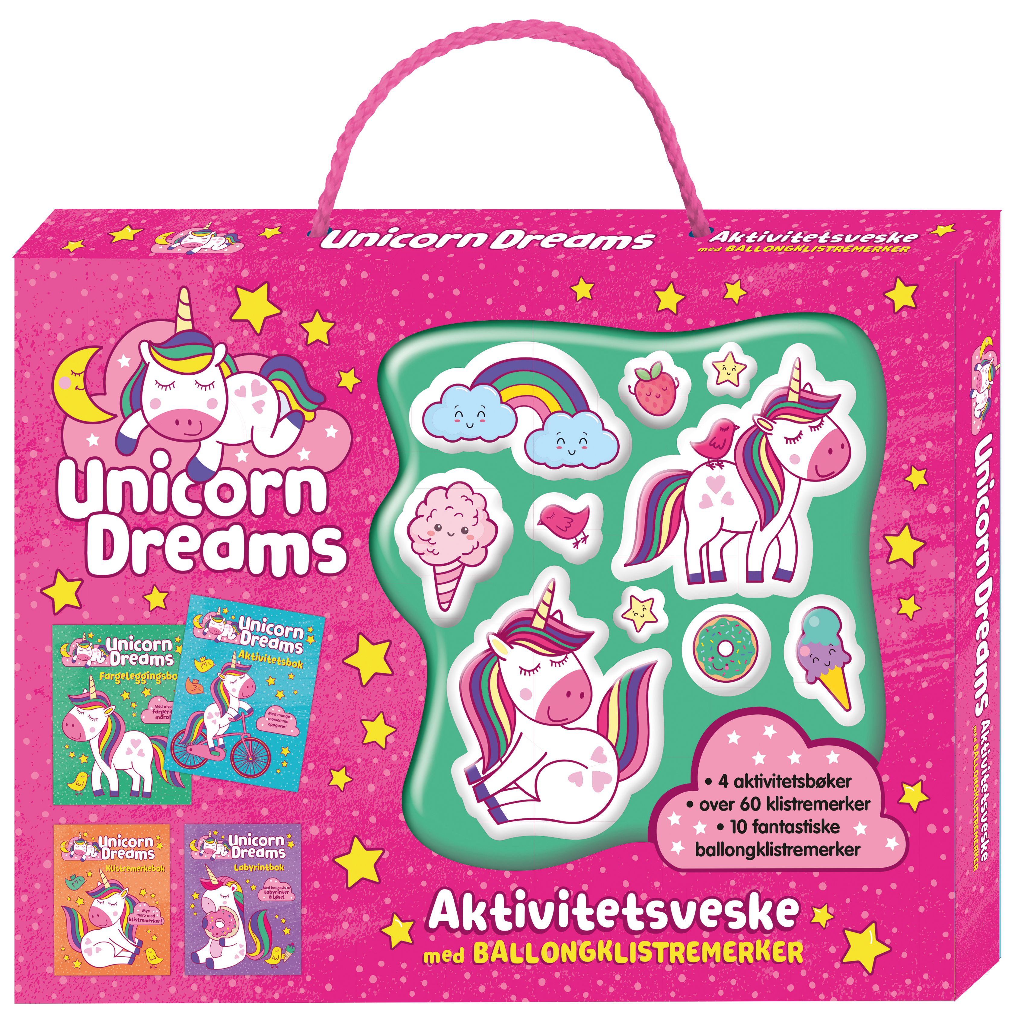 I denne praktiske vesken med håndtak finner du fire aktivitetsbøker fulle av søte enhjørninger og andre vakre magiske skapninger. Det følger med over 60 flotte klistremerker og 10 metalliske 3D-klistremerker som du kan pynte med. Timevis med aktivitetsmoro som du kan ta med hvor som helst.